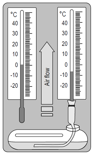 Left: dry-bulb (standard) thermometer measuring the air temperature. Right: wet-bulb thermometer wrapped in a moist wick dipped in water—evaporation cools the bulb, so its reading drops below the air temperature in dry air and sits closer to it when the air is humid.